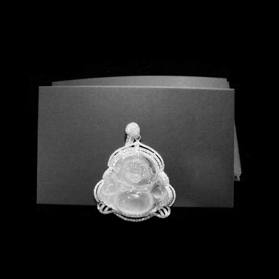 This jade pendant features the shape of the buddha. The jade shows a clear white color. It is complemented by shiny loose diamonds around it.