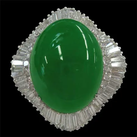 This stunning platinum 900 ring boasts a 21.64ct oval jade, which is flawlessly smooth and polished. The rectangular diamond set gives splendid sparkle and luxurious flair. This magnificent jade ring is a perfect addition for fine jewelry collectors.