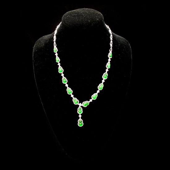 This impressive jade and diamond necklace features a delightful motif of miniature gourd. The simplistic design highlights the exquisite touch of oriental charm. This extravagant necklace complements your evening look gorgeously.