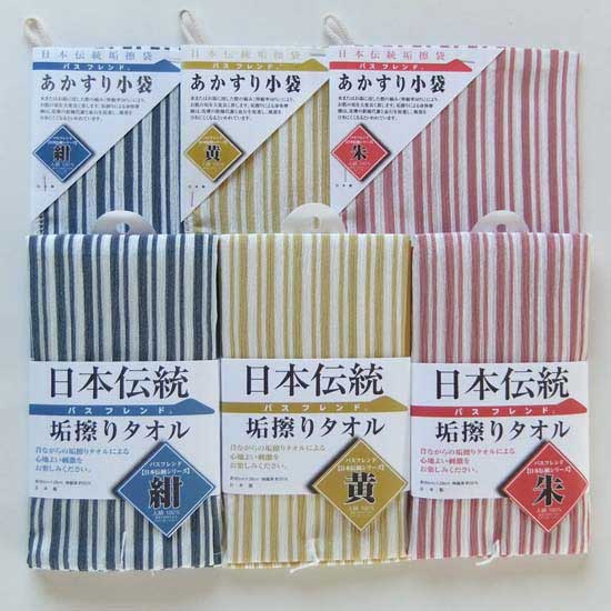 Shown here are a towel and a mitten coming in a traditional Japanese Akasuri style. The rough texture brings you an excellent peeling effect. The rough texture rubs off grime gently without the use of soap.