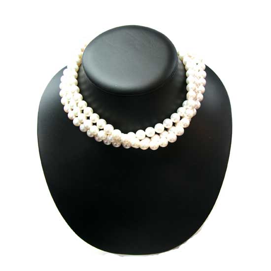The ravishing double-stranded ladies' necklace is meticulously crafted with round and clean Japanese cultured pearls. The high-luster white pearls deliver perfect radiance with irresistible beauty. The simple yet elegant appearance of the single-stranded necklace makes a down-to-earth accessory for accentuating your evening gowns.