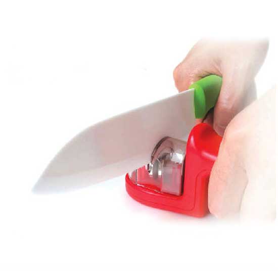 The sharpener is designed for both steel knives and ceramic knives with diamond coated grinding wheel. By using the wheel, you can feel the sharpening quite easy with good performance. The sharpener is also designed for washing in water to be disassembled easily.