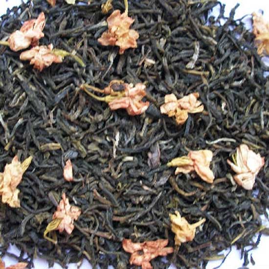 The outlined aromatic jasmine tea originates from China. It is made from green tea leaves scented with well-picked jasmine flowers. It is suggested that drinking jasmine green tea help protect your body from aging and lower blood pressure.