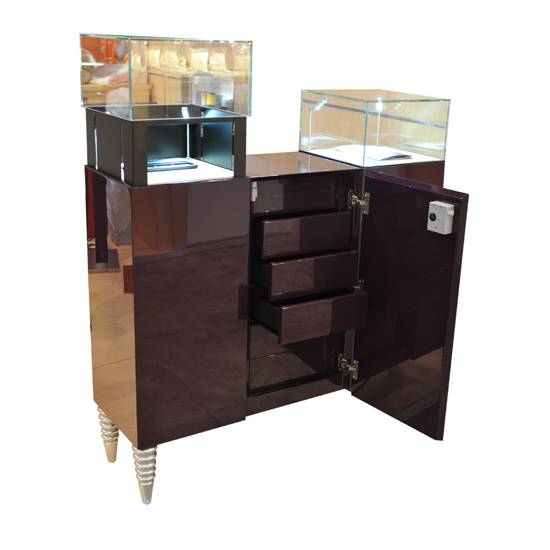 This jewellery display unit is a multi-section storage cabinet with glass windows on the top.