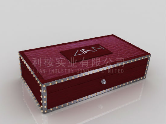 The showcased jewelry case accents a lavish burgundy appearance, highlighting with glistening edges. Tiny beads embellish above the silvery edges with a splendid touch. A small lock is located on the front to sturdily secure your content.