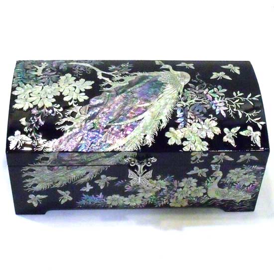 Showcased here is a jewelry box with an elegant and stylish look in a shape of a rectangle. The Korean-style decoration on the box is made of pearl that casts a touch of glamor over the entire piece. This decorative jewelry box is the perfect for displaying precious rings and necklaces.