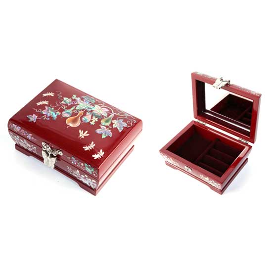 This exquisite wooden jewelry box is lavishly ornamented with mother-of-pearl flower painting. The elaborated ornament of the entire body makes it a breathtaking piece for storing personal fashion items. OEM project is also welcome.
