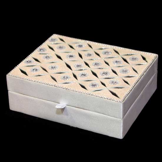 Displayed is a jewelry box coming in a neat cuboid shape. Its cover features glittery trimmings which dazzle your eyes. The edge of it is accented with a row of dainty beads.