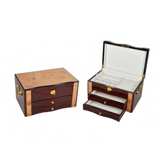 This dainty jewelry box comes with a top-open main compartment and two drawers for better organization. The main compartment features a lock for added security. It is ideal for storing jewelry and other small-sized miscellaneous items.