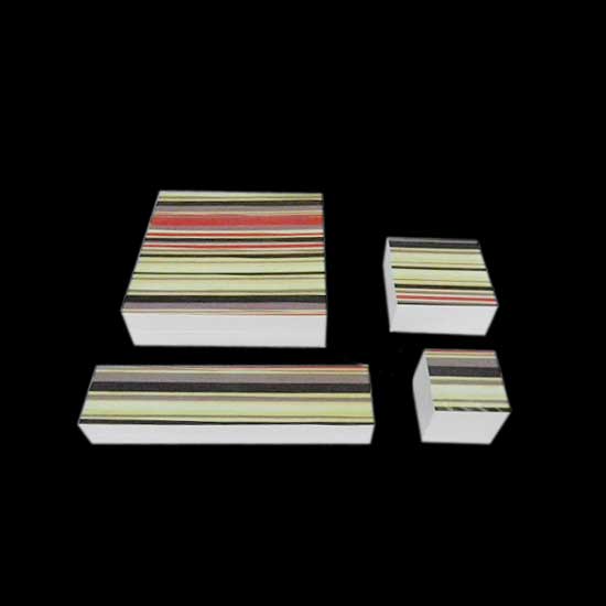 This is a series of rectangular and square jewelry boxes available in different sizes. The multi-colored striped patterns add a touch of style to each piece. This jewelry box series is ideal for keeping different jewelry pieces in good condition.