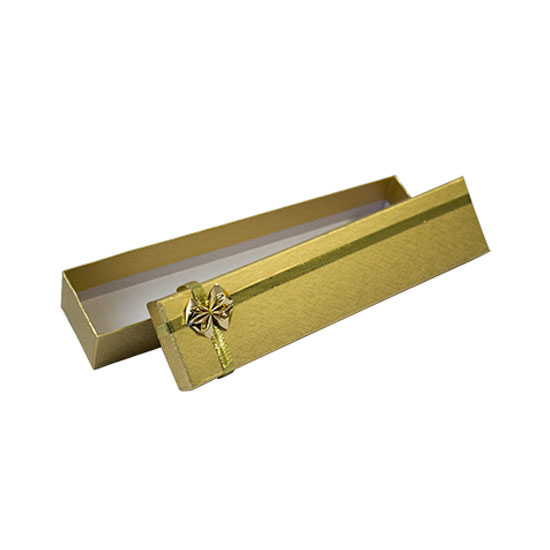 This jewelry box is designed in a slender rectangular shape. Its exterior comes in allover gold for adding a touch of luxuriousness to the internal packed item. The dainty bow complements this design for a perfect finish.