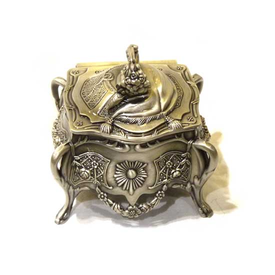 This is a jewelry box that comes with intricate decorative patterns. Featuring four legs, this jewelry box is sturdy and firm. This zinc alloy jewelry box is a great choice for gifts.