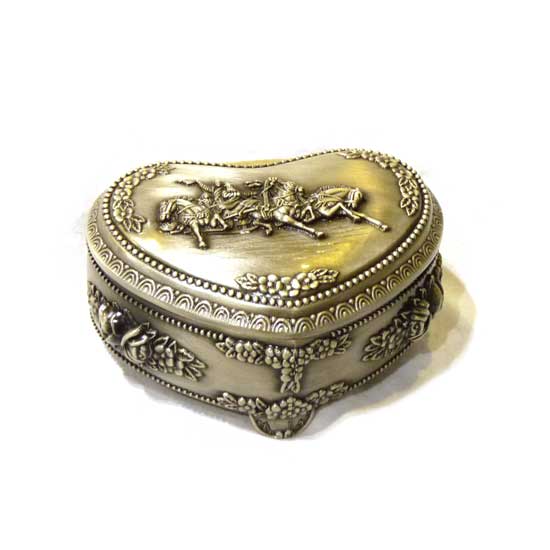 This is a jewelry box that comes in a heart shape. With intricate decorative patterns, this jewelry box showcases detailed craftsmanship. This high quality jewelry box is made of zinc alloy for durability.