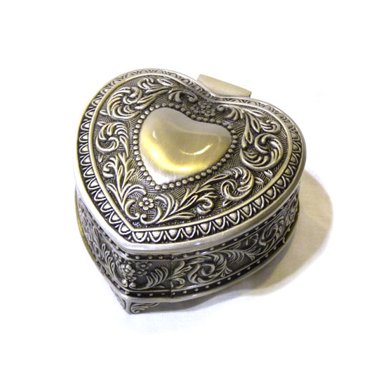 This is a zinc alloy jewelry box in a heart shape. Featuring detailed craftsmanship, this jewelry box is decorated with intricate patterns. This beautiful jewelry box is ideal for gifts.
