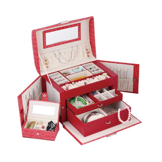 This is a jewelry box with a sophisticated design. It comes with multiple compartments for keeping assorted jewelry pieces in order. The robust and rugged structure promises a long service life.