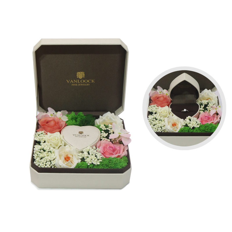 • Heart box: heart shape plastic shell in size 9x8.5x3.2/2.4cm, wrapped with white cross pattern PU leather exterior, and brown satin inside of lid, brown velvet insert