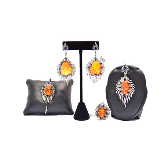 This is a well-designed jewelry collection with earrings, charms and bracelets. The jewelry collection is crafted with orange amber stones in the middle for a glamorous touch. Add elegance and charm to your look with this jewelry collection.