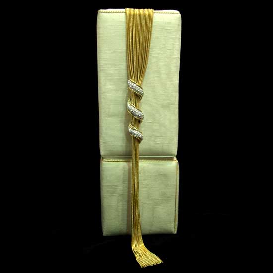 This gorgeous necklace features an 18K yellow gold construction. It boasts a sleek design with diamonds, showcasing a touch of sophistication. Add this stylish necklace to your jewelry collection.