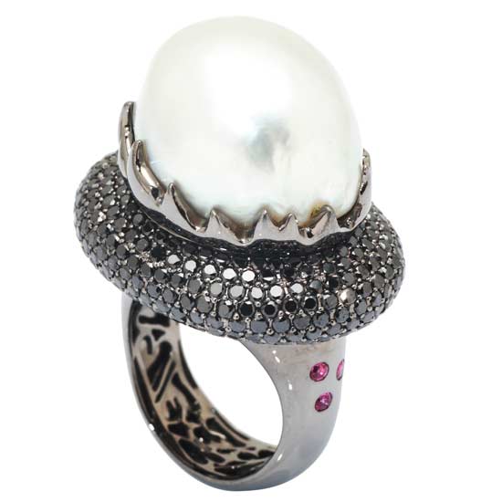 This stylish ring features a dazzling silvery construction. It boasts sparkling diamond-like gemstones and a white pearl-like ornament in the center. This gorgeous ring is suitable for special occasions.