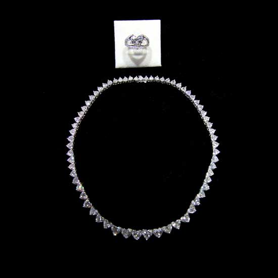 Featured here is a set of jewelry with elegance and style. The set offers a ring and a necklace, both finely crafted with sparkling diamonds for a luxurious touch. This set is best to pair with your evening dress for a look of perfection.