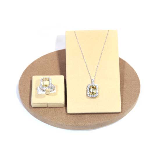 This is a set of jewelry that includes a finger ring and a necklace. Each piece features a sparkling embellishment with a big yellow stone surrounded by various small white elements. Elegant and exquisite, this set of jewelry surely is a perfect accessory for your trendy outfit.