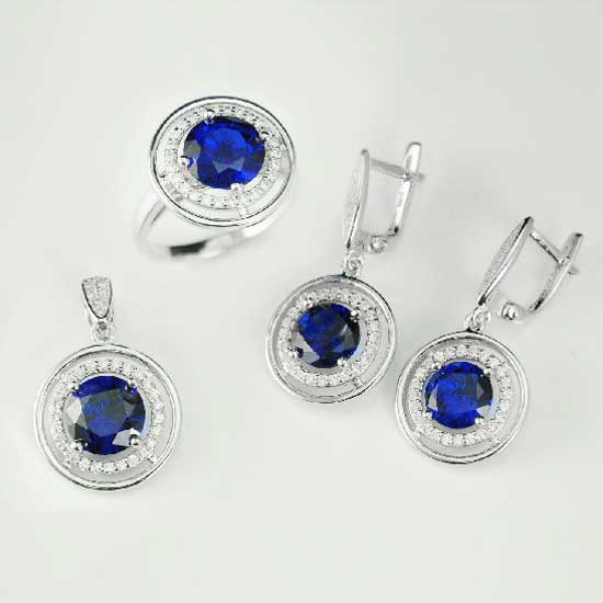 This jewelry set includes a pair of earrings, a finger ring and a pendant. The larger well-cut sapphire stone is well mounted on the 925 sterling silver setting. The allover dazzling stones add a touch of style to the whole piece.