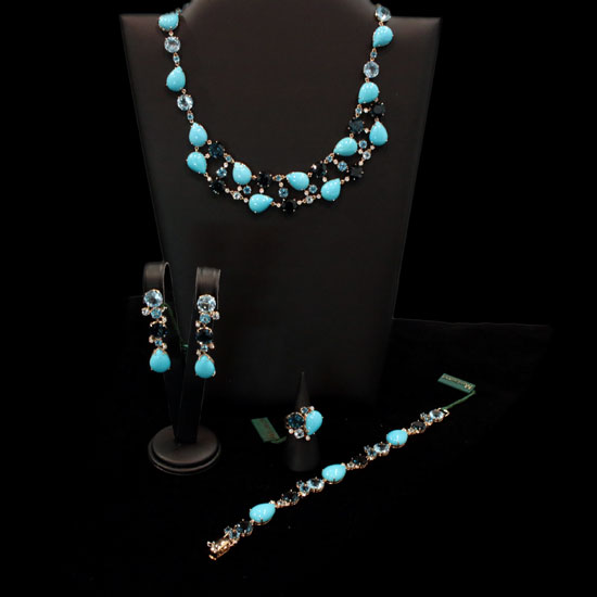 This is a fashionable jewelry set with a finger ring, a pair of earrings, a necklace and a bracelet. This jewelry set is crafted with diamond, natural turquoise and London topaz stones for a glamorous touch. This well-designed jewelry set will add elegance and charm to your look.