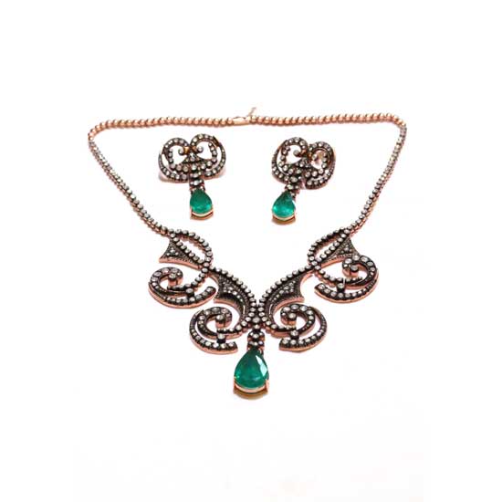 This is a jewelry set that comes with a necklace and a pair of earrings. It boasts a unique and elegant design. Each piece features a rose gold mounting with an emerald stone embellishment.