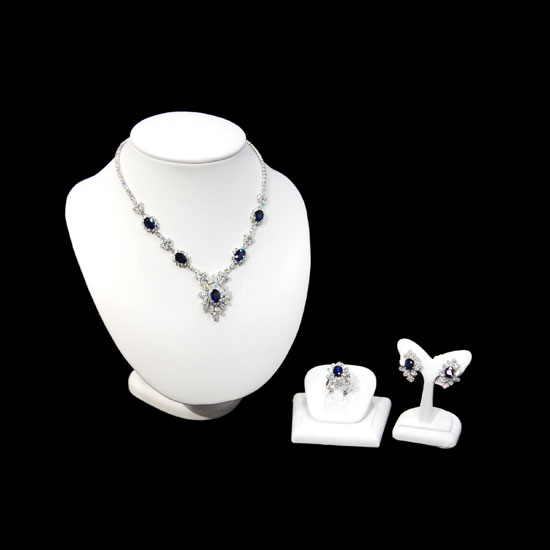 This is a high-quality jewelry set with a necklace, a pair of earrings and a finger ring. This jewelry set is crafted with dazzling diamonds and sapphires for an elegant touch. This well-designed jewelry set is ideal for complementing your chic look.