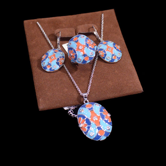 This is a fashionable jewelry set that includes a pair of earrings, a finger ring and a necklace with a matching design. All the pieces come in bright colors for a vibrant look. This elegant jewelry set is an ideal choice for modern ladies.