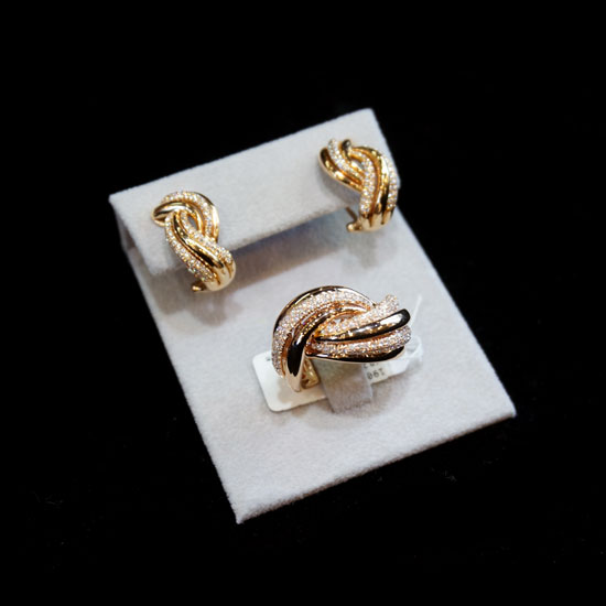 This is a stylish jewelry set with a pair of earrings and a ring. It is crafted with dazzling diamonds for an eye-catching look. Add elegance and charm to your look with this jewelry set.