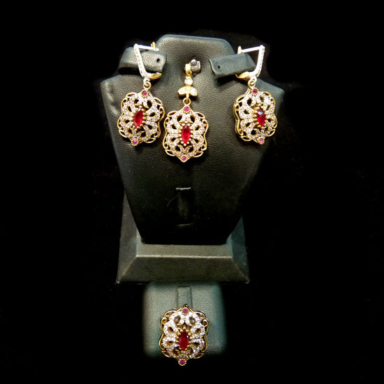 This jewelry set comes with a pair of earrings, a pendant, and a ring. The cubic zirconia is carefully selected and polished to shine with a bright red hue. It effortlessly steals the limelight at your evening function.