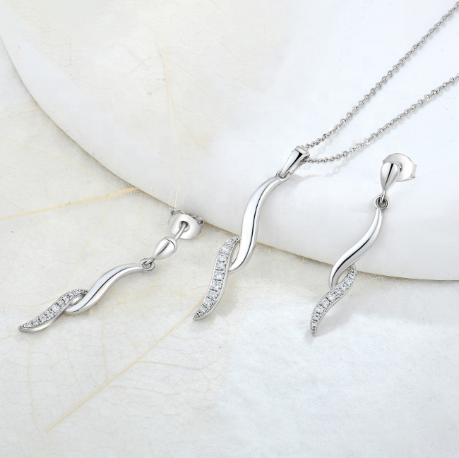 An epitome of soft feminine energy, this Jewelry Set — including a matching necklace and drop earrings — is defined by its graceful wave design that adds depth and visual interest to any look. The signature wave element vividly resembles a flowing ribbon, embellished with a line of small sparkling zircon stones for subtle luxury and movement. The set’s drop-style earrings feature a secure post-back design, while the necklace’s pendant hangs from a delicate cable chain in a polished silver tone.