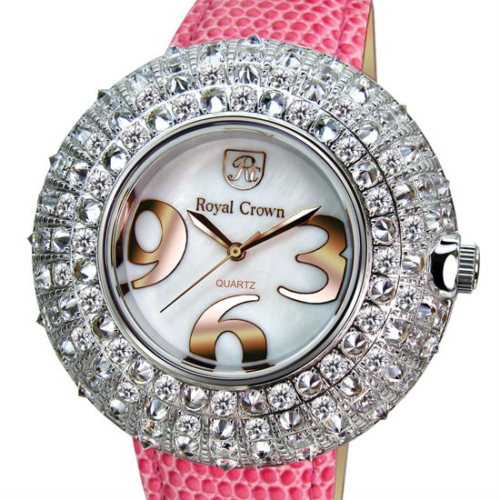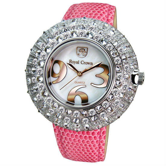 Presented is a watch with pink leather-like straps and a bezel decorated with sparkling CZ stones. This eye-catching timepiece features big Arabic numeral marking for easy reading of time. The crocodile-skin pattern on the straps brings an added touch of style.