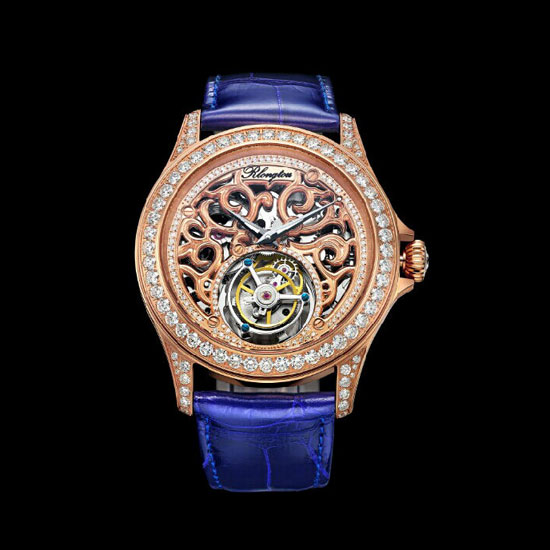 This is a tourbillon jewelry watch that comes with a high-precision mechanical movement. The allover dazzling diamonds on the 18K gold case add a touch of luxuriousness to the whole piece. This high-quality leather strap fits comfortably on your wrist.