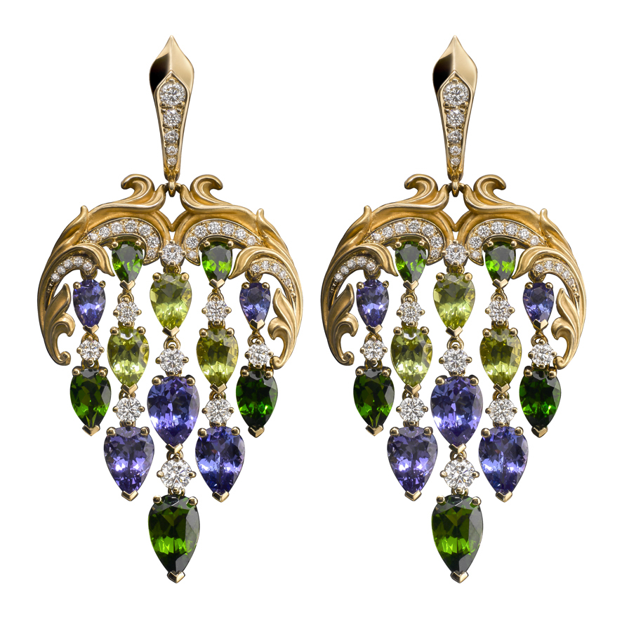 - Made with 18kt Gold, Diamonds, Diopsites, Tanzanites and Peridots