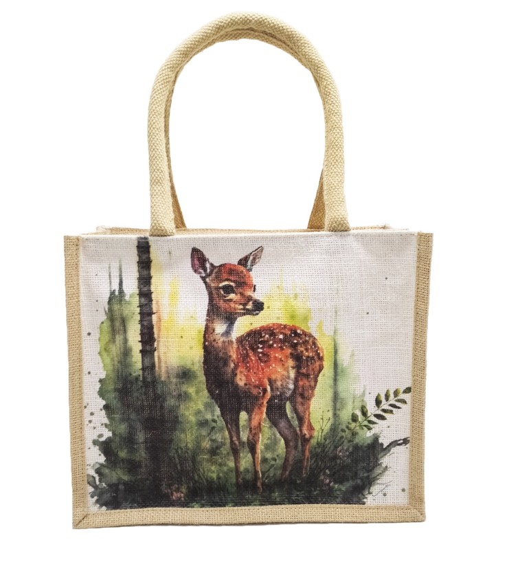 Eco-friendly jute bags crafted from high-quality 14x15 grade jute, featuring a secure zipper closure and vibrant digital printing. Dimensions: 30 x 25 x 12 cm.