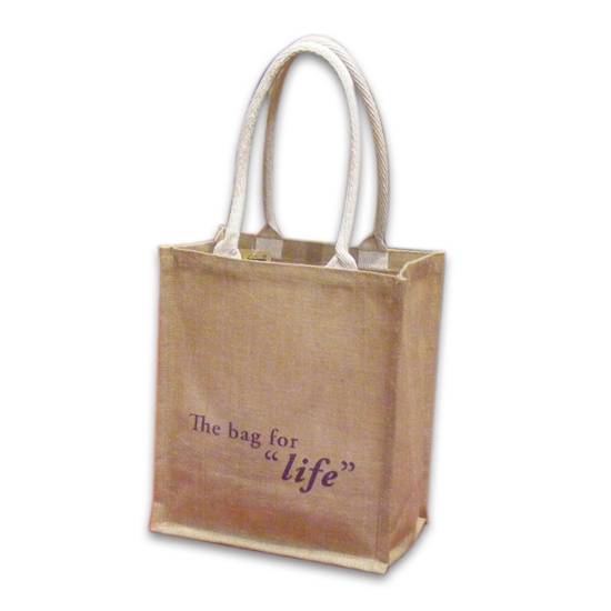 This is a jute shopping bag with long white handles. It is tough, reusable and environmental-friendly, which is suitable for carrying food and other groceries when shopping.