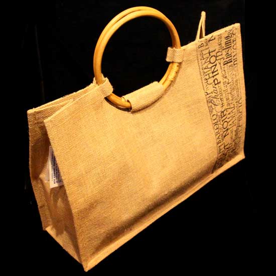 Shown here is a bag made of jute. It comes with rigid handles for enhanced durability. This jute bag is a green choice for shopping.