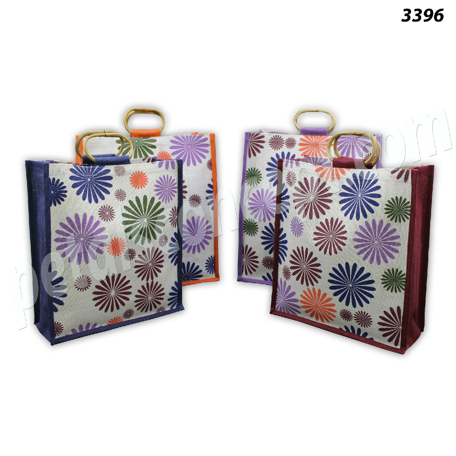 Description: PP laminated jute shopping bag with oval cane handle, gusset & both side floral screen print