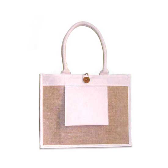 This two-toned shopping bag features blended construction of jute and cotton. It is designed with multiple compartments to keep your necessities. The dual rolled handles and the button closure complete the design of this piece.