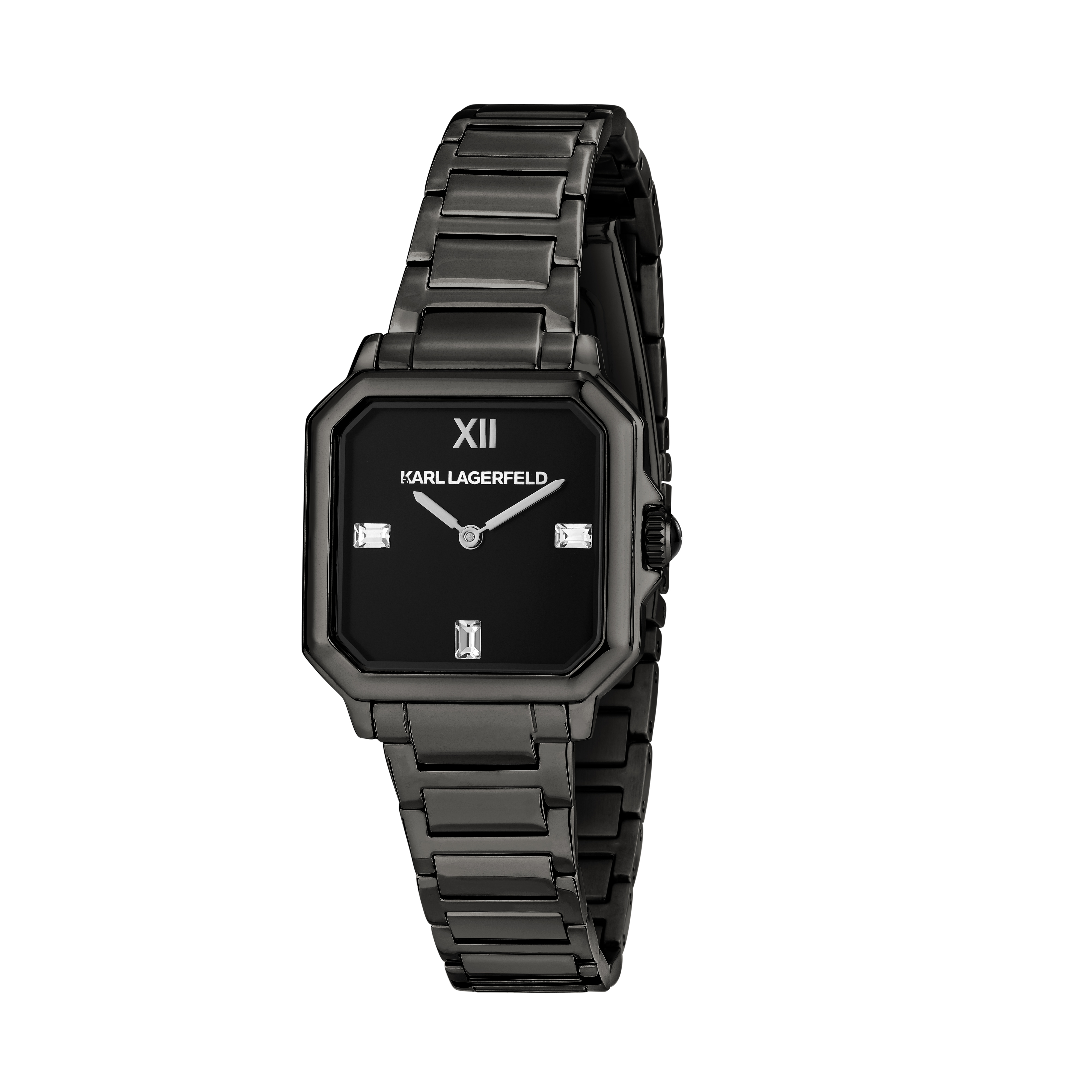 Karl Lagerfeld Women's Watch, ref. R0553102504, SQUARE CLASSICS Collection, in steel, quartz movement, time only function. The watch features a steel strap, with a hidden clasp. The watch case measures 33x27.80mm, surrounds a black dial and is fitted with a resistant mineral glass. Water resistance up to 3 ATM. The watch is contained in its original packaging.