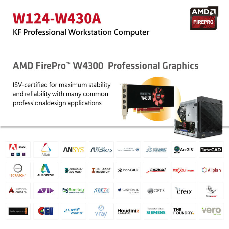 KF W124-W430A is a flexible, powerful and professional small form factor workstation. The computer equipped with AMD FirePro™ W4300 Professional Graphics, which is certified on more than 100 different applications for improved performance and reliability, including the most popular design and engineering and media and entertainment applications.