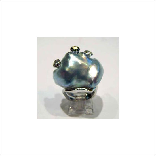 Keshi pearl (28mm) mounted to 18k white gold ring with three bezel-set diamonds.