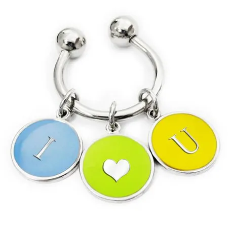 This is a key chain in silver. The key chain is locked by crossing the beam of the chain, and the balls on both ends prevent the beam from bounding to original shape. The plates on the key chain are colors with simple wordings.
