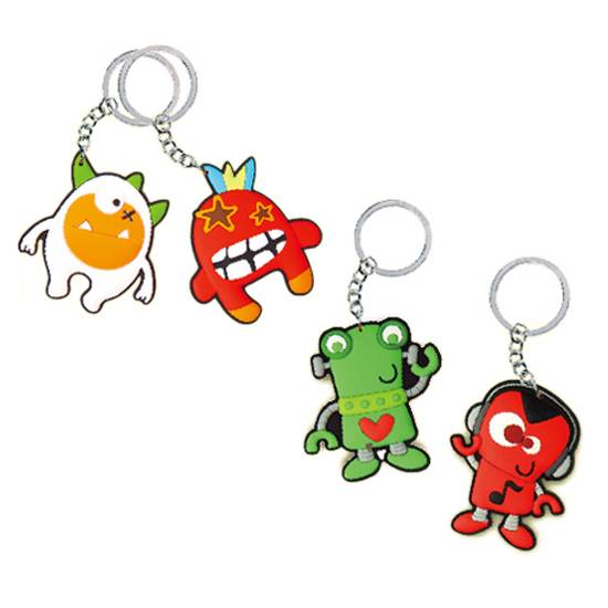 These are key chains which are decorated with cartoon designs. The key chains are made of soft plastic and decorated colorfully.
