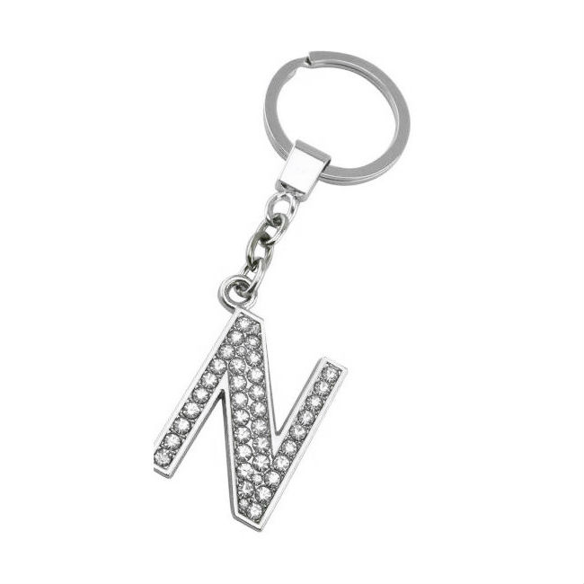 Displayed here is a keychain with a capital letter “N” ornament. The keychain comes in a silver tone and is adorned with gemstones on the letter “N”. It has a split ring for attachment and makes an excellent gift choice.
