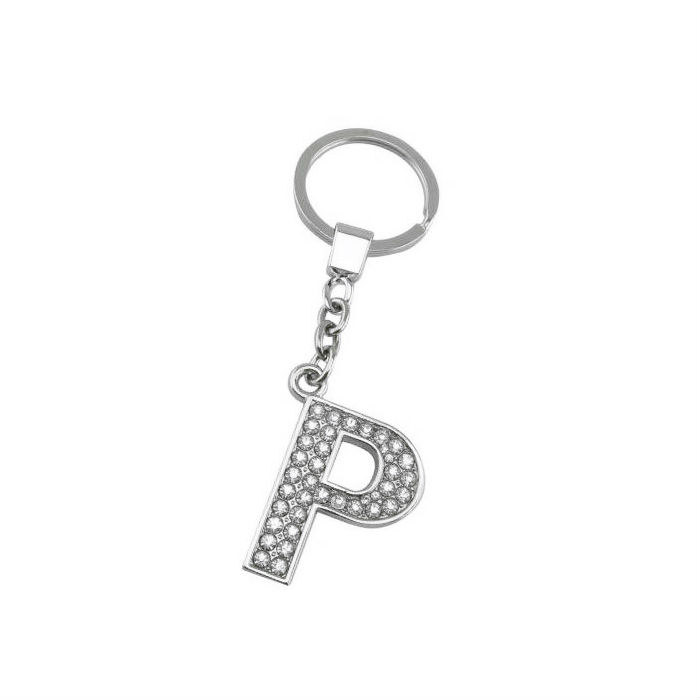 This key ring is made of metal and comes in a “P” shaped design. It has a silver toned exterior and is paved with shimmering stones on the letter “P”. The key ring has a round split ring on top for attaching to bags or key bags.