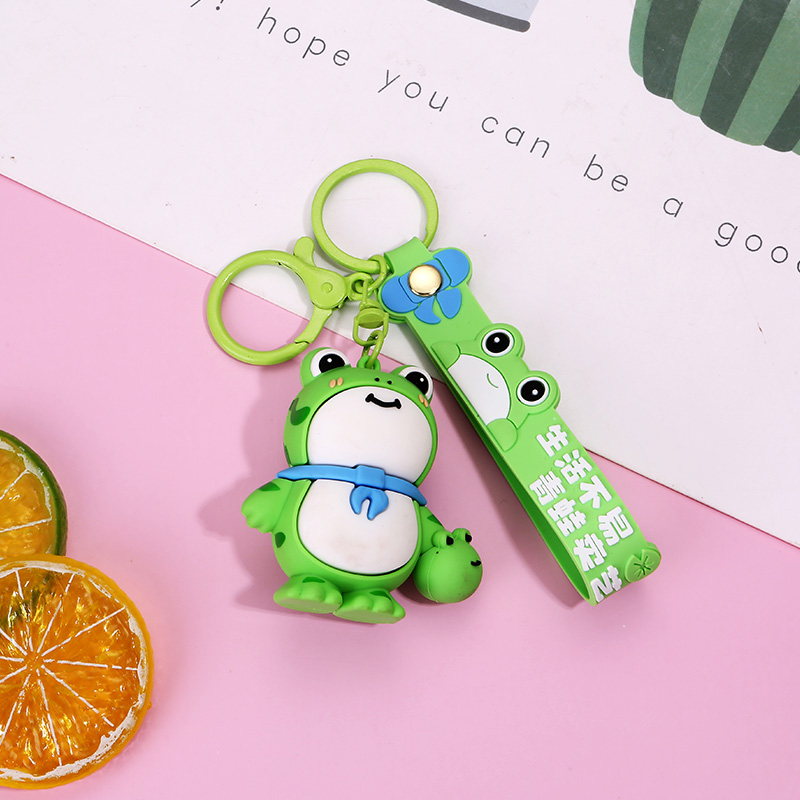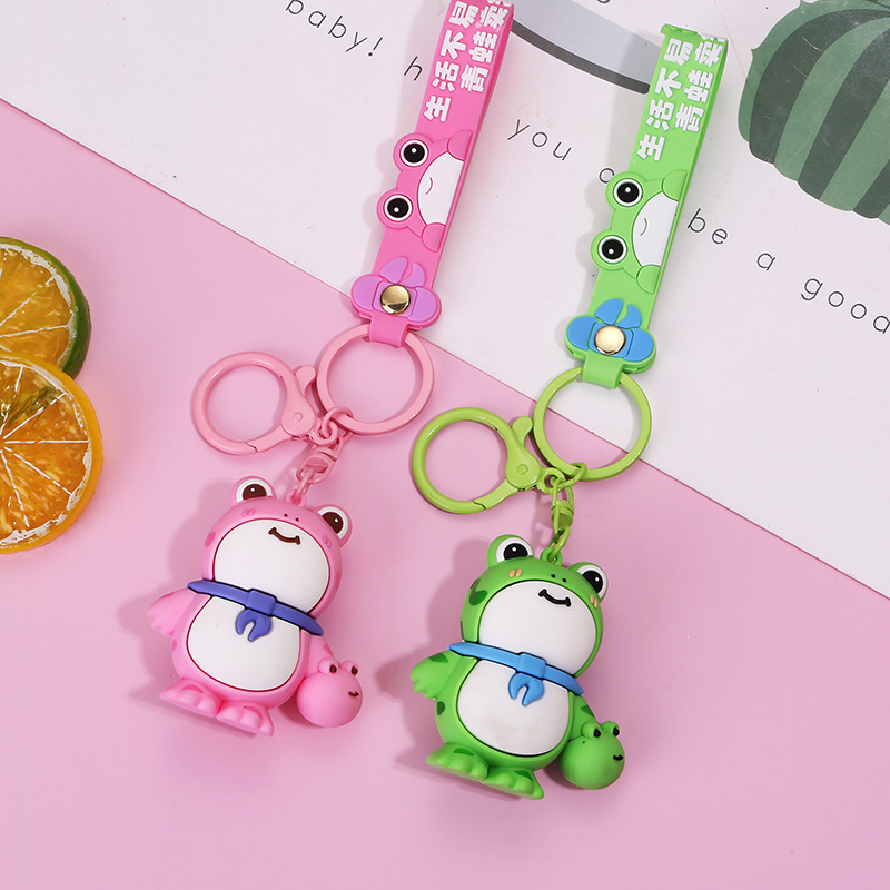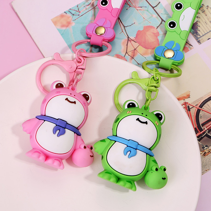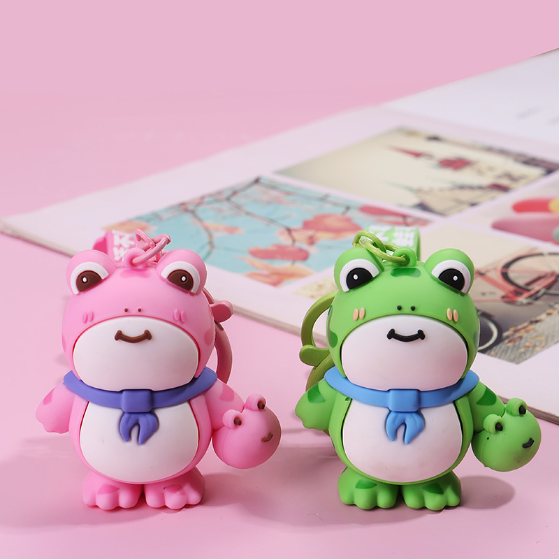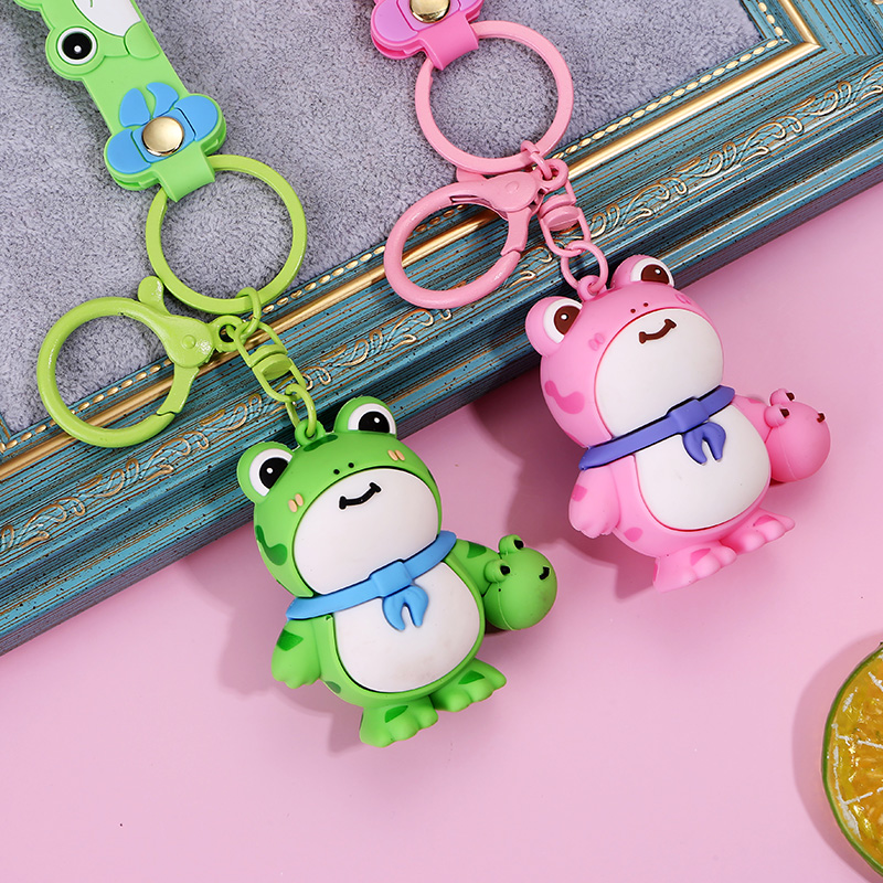 These are delightful frog - shaped keychains. One is pink and the other is green, both with big eyes, a cute smile, and a small scarf around their necks. They even hold a tiny frog in one hand. Ideal for hanging on keys or bags to add a touch of charm.