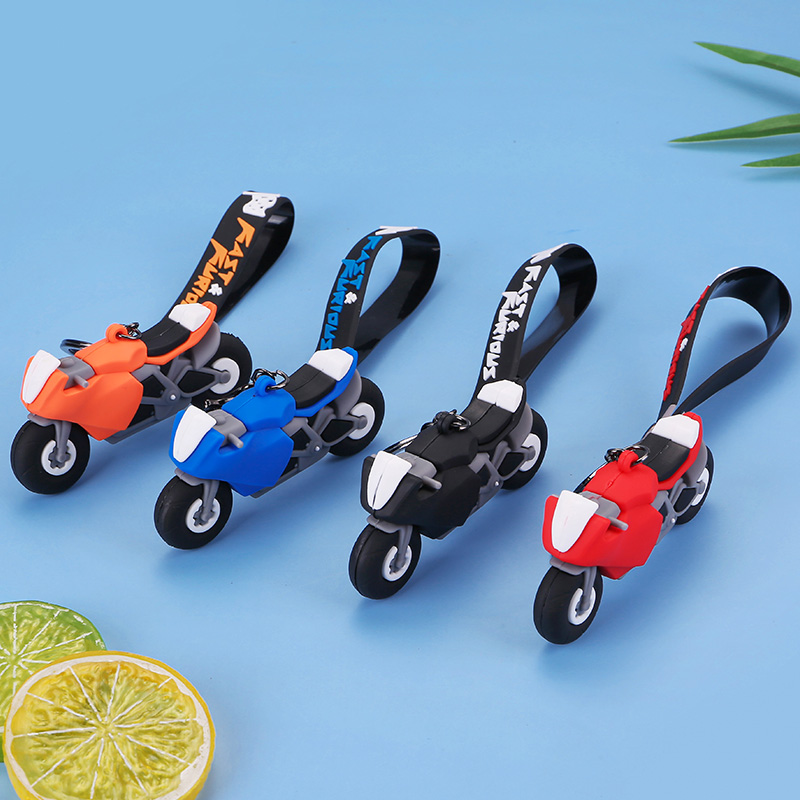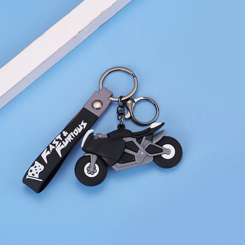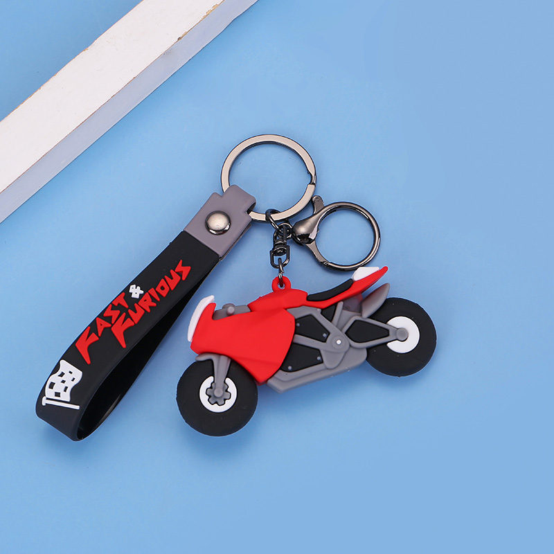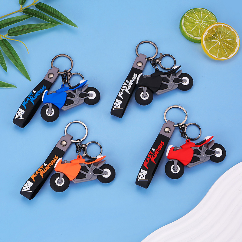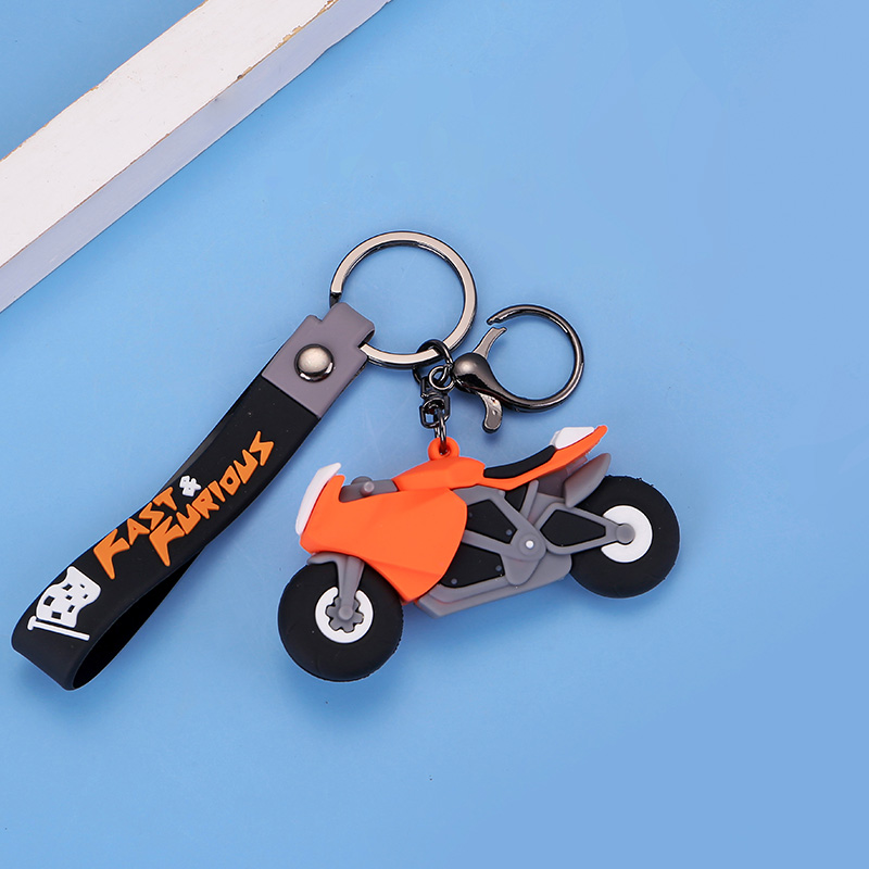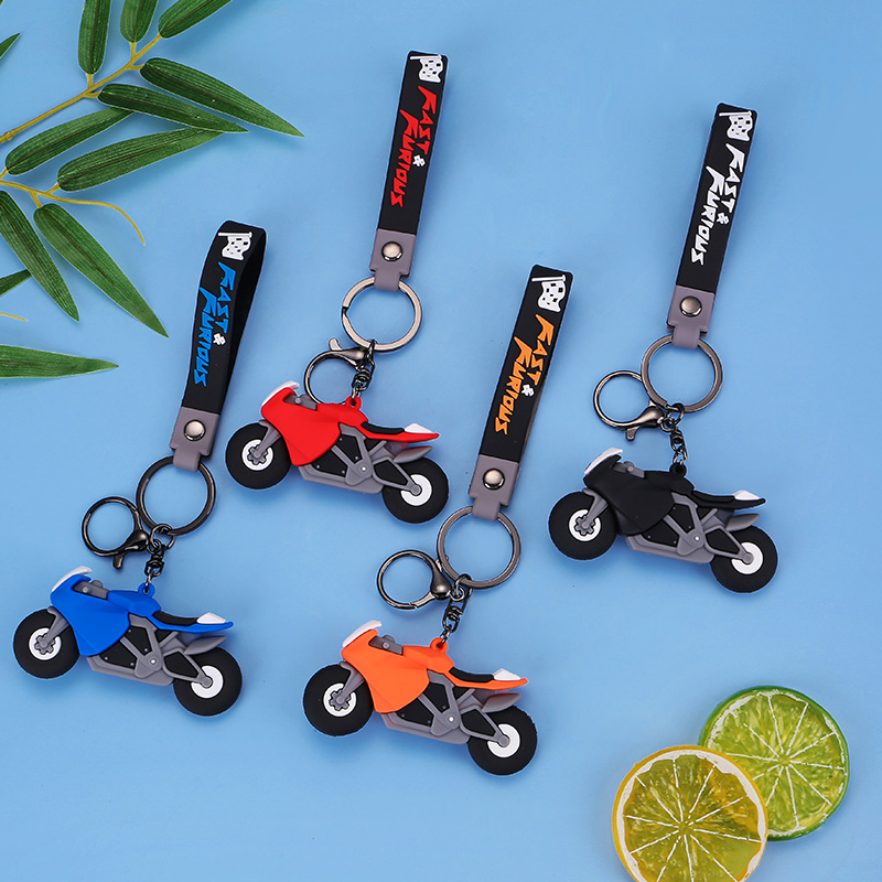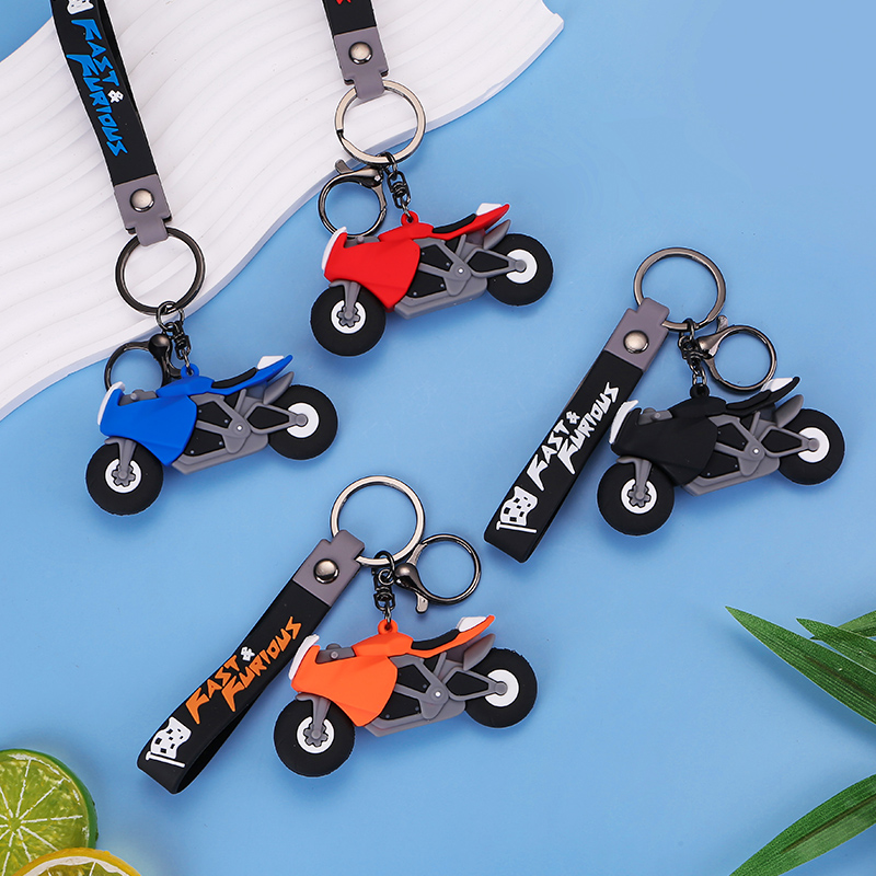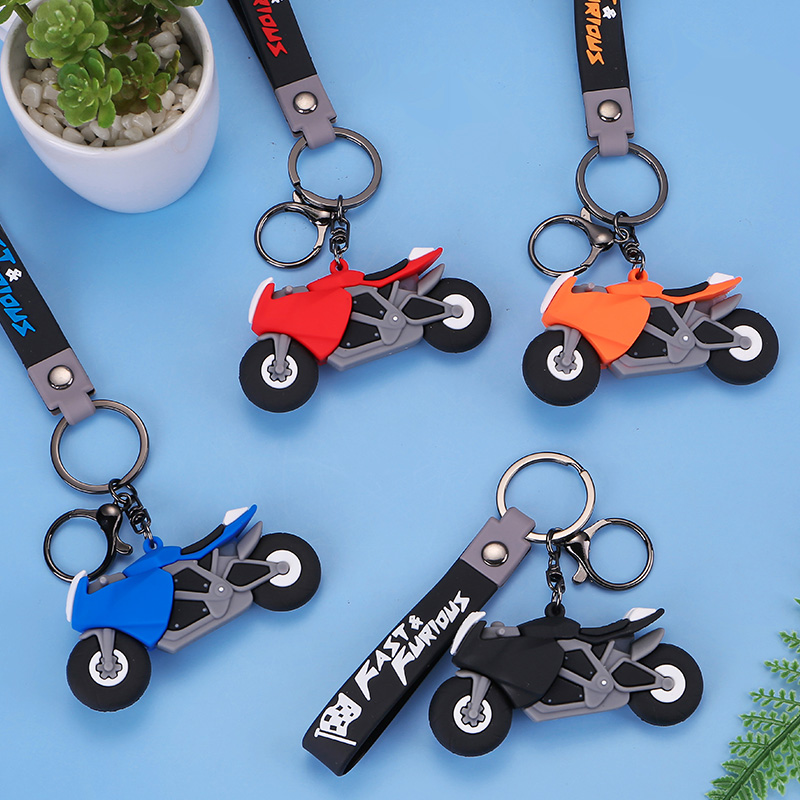 These are keychains. Shaped like motorcycles, they come in colors like blue, black, orange, and red. Each keychain has a key - ring attachment. Ideal for fans of the franchise, they're perfect for organizing keys or as decorative items.